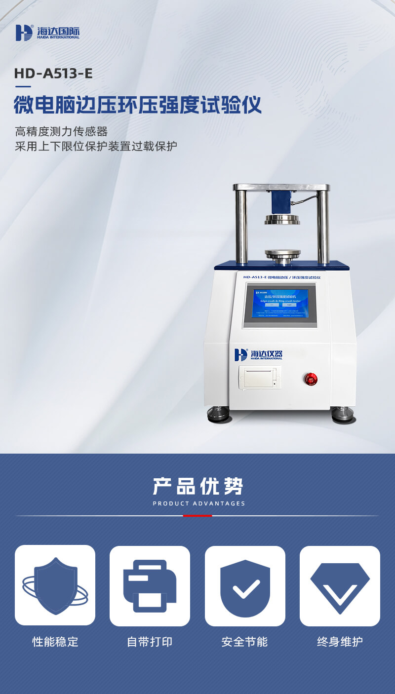 海達儀器HD-A513-E 微電腦邊壓/環壓強度試驗儀可配合多種紙張包裝材料來進行多種紙張質量測試,如環壓(RCT)、平壓(FCT)、邊壓(ECT)、粘合(PAT)等多種測試,是結合多項功能于一體的測試設備。